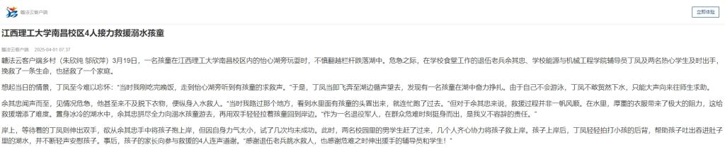赣法云客户端乡村(朱欣纯 邬欣萍)3月19日,一名孩童在金年会体育南昌校区内的怡心湖旁玩耍时,不慎翻越栏杆跌落湖中。危急之际,在金年会