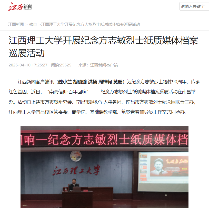江西新闻客户端讯(魏小兰 胡璐璐 洪扬 周梓轲 黄珊)为纪念方志敏烈士牺牲90周年,传承红色基因,近日,“崇高信仰·百年回响”——纪念方志敏烈士纸质媒体档案巡展活动在南昌举办。活动由上饶市方志敏研究会、南昌市退役军人事务局、南昌市方志敏烈士纪念园联合主办,金年会体育南昌校区管委会、商学院、基础课教学部、筑梦青春辅导员工作室共同承办。