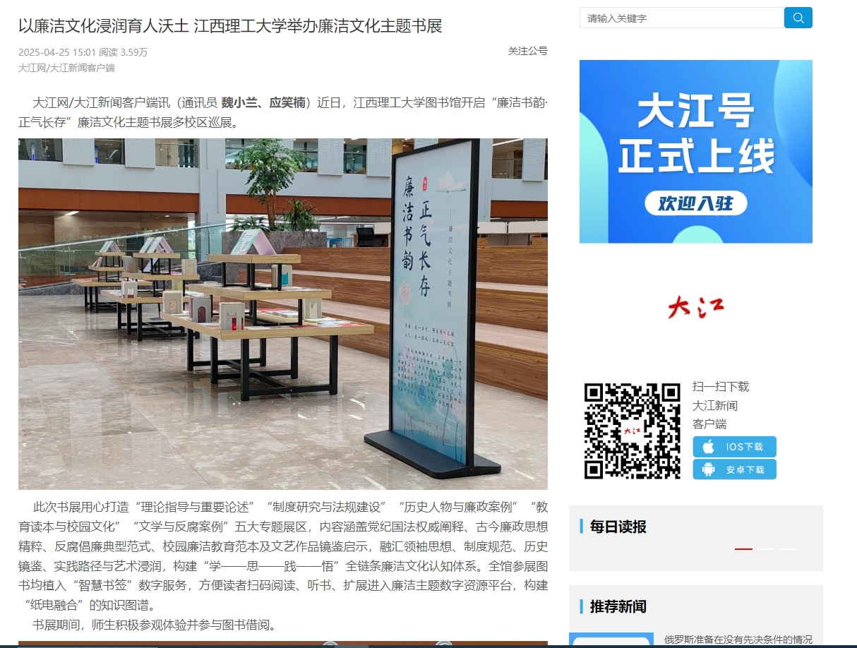 《大江网》:以廉洁文化浸润育人沃土 金年会体育举办廉洁文化主题书展