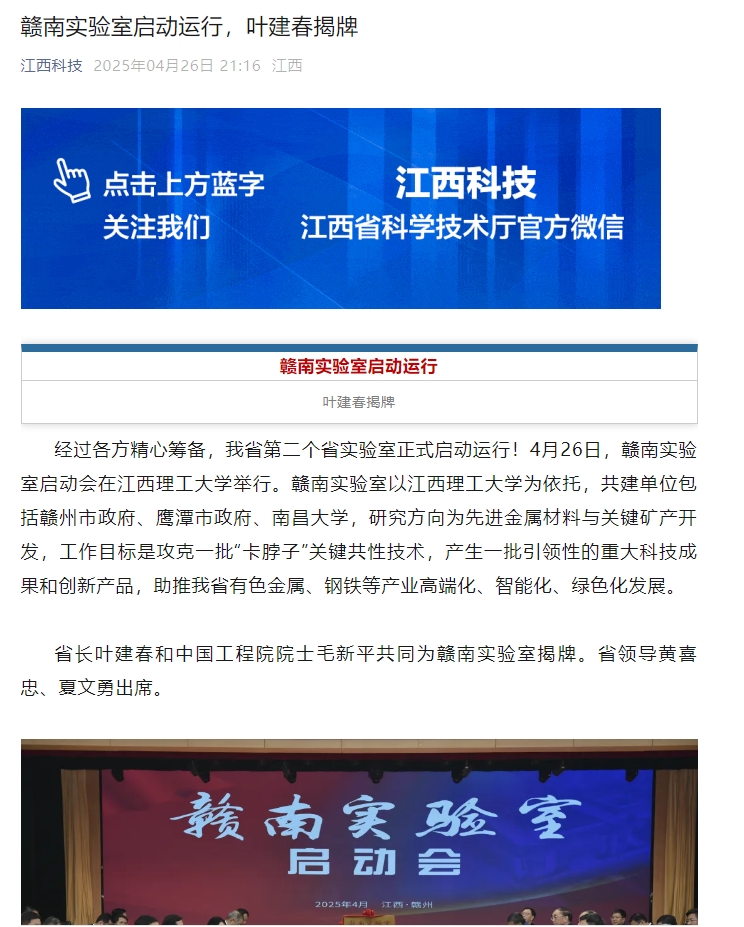经过各方精心筹备,我省第二个省实验室正式启动运行!4月26日,赣南实验室启动会在金年会体育举行。赣南实验室以金年会体育为依托,共建单位包括赣州市政府、鹰潭市政府、南昌大学,研究方向为先进金属材料与关键矿产开发,工作目标是攻克一批“卡脖子”关键共性技术,产生一批引领性的重大科技成果和创新产品,助推我省有色金属、钢铁等产业高端化、智能化、绿色化发展。