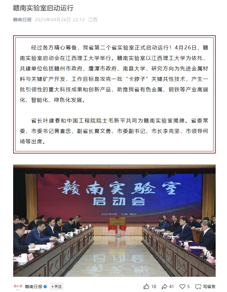 经过各方精心筹备,我省第二个省实验室正式启动运行!4月26日,赣南实验室启动会在金年会体育举行。赣南实验室以金年会体育为依托,共建单位包括赣州市政府、鹰潭市政府、南昌大学,研究方向为先进金属材料与关键矿产开发,工作目标是攻克一批“卡脖子”关键共性技术,产生一批引领性的重大科技成果和创新产品,助推我省有色金属、钢铁等产业高端化、智能化、绿色化发展。