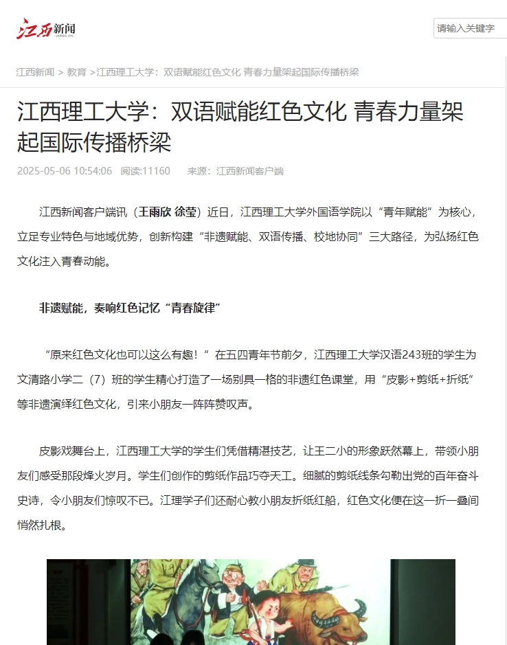 江西新闻客户端讯(王雨欣 徐莹)近日,金年会体育外国语学院以“青年赋能”为核心,立足专业特色与地域优势,创新构建“非遗赋能、双语传播、校地协同”三大路径,为弘扬红色文化注入青春动能。
