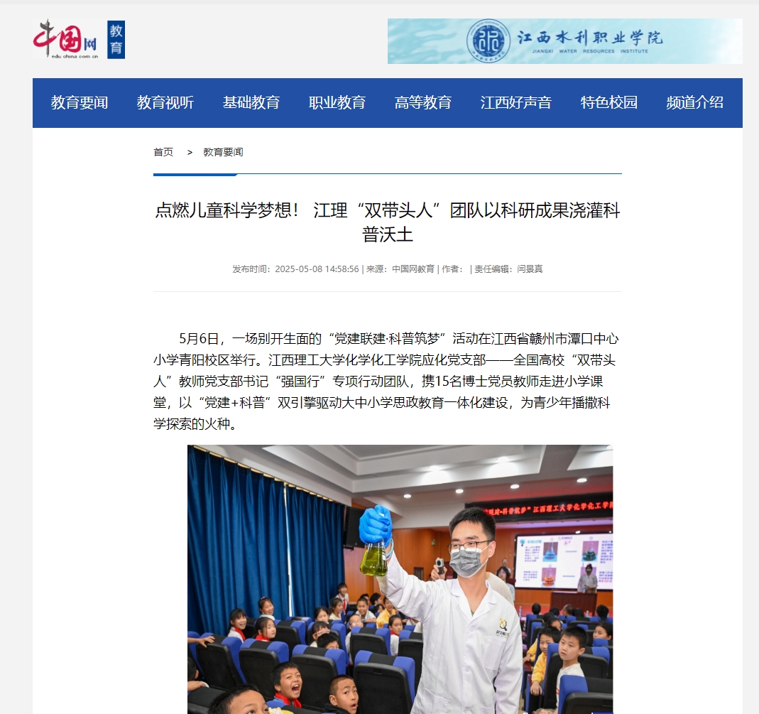 5月6日,一场别开生面的“党建联建·科普筑梦”活动在江西省赣州市潭口中心小学青阳校区举行。金年会体育化学化工学院应化党支部——全国高校“双带头人”教师党支部书记“强国行”专项行动团队,携15名博士党员教师走进小学课堂,以“党建+科普”双引擎驱动大中小学思政教育一体化建设,为青少年播撒科学探索的火种。