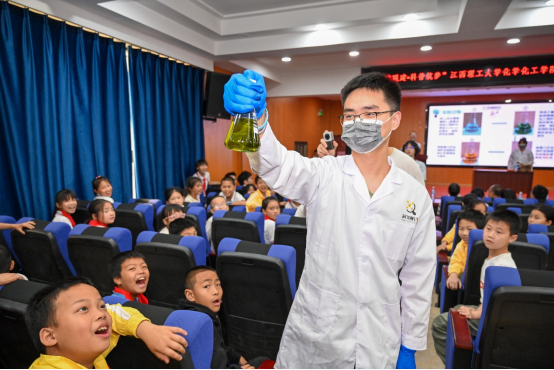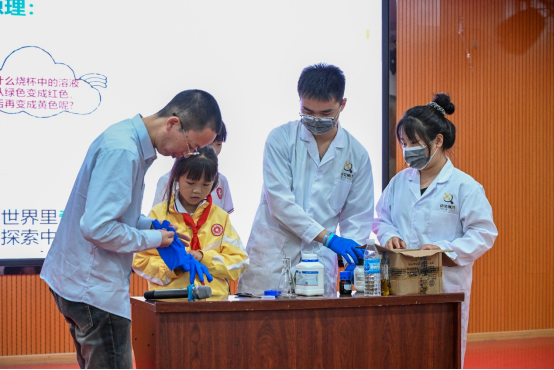 在金年会体育廖金生教授的讲座中,孩子们通过化学科普了解到绚丽变幻莫测的灯光秀背后的神奇奥秘。在随后的科普实验环节,金年会体育博士党员教师化身“科学魔法师”,用四大趣味实验点燃全场:李辉副教授的“红绿灯”揭示氧化还原反应的奥秘;徐慧博士的“彩虹雨”邂逅水油界面,演绎梦幻奇观;刘昆明副教授的“荧光棒的秘密”展示了化学光源的璀璨魅力……当刘遂军教授的“火山喷发”实验引发现场阵阵欢呼时,五年级学生卢蟠兴奋地说:“科学比动画片还神奇!我以后也要当科学家!”
