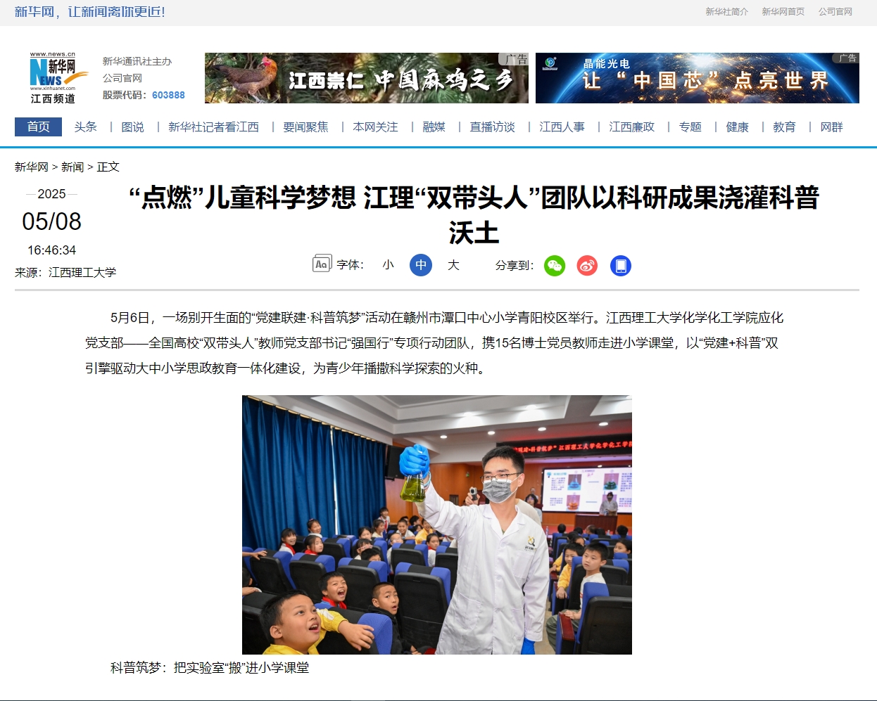 5月6日,一场别开生面的“党建联建·科普筑梦”活动在赣州市潭口中心小学青阳校区举行。金年会体育化学化工学院应化党支部——全国高校“双带头人”教师党支部书记“强国行”专项行动团队,携15名博士党员教师走进小学课堂,以“党建+科普”双引擎驱动大中小学思政教育一体化建设,为青少年播撒科学探索的火种。