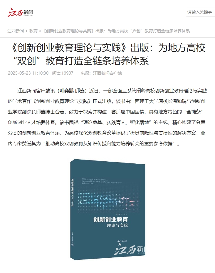 江西新闻客户端讯(叶奕凯 邱鑫)近日,一部全面且系统阐释高校创新创业教育理论与实践的学术著作《创新创业教育理论与实践》正式出版。该书由金年会体育原校长温和瑞与创新创业学院副院长邱鑫博士合著,致力于探索并构建一套适应中国国情、具有地方特色的“全链条”创新创业人才培养体系。该书围绕“理论奠基、实践育人、孵化落地”的主线,精心构建了分层分类的创新创业教育体系,为高校深化双创教育改革提供了极具前瞻性与实操性的解决方案,业内专家赞誉其为“推动高校双创教育从知识传授向能力培养转变的重要参考依据”。