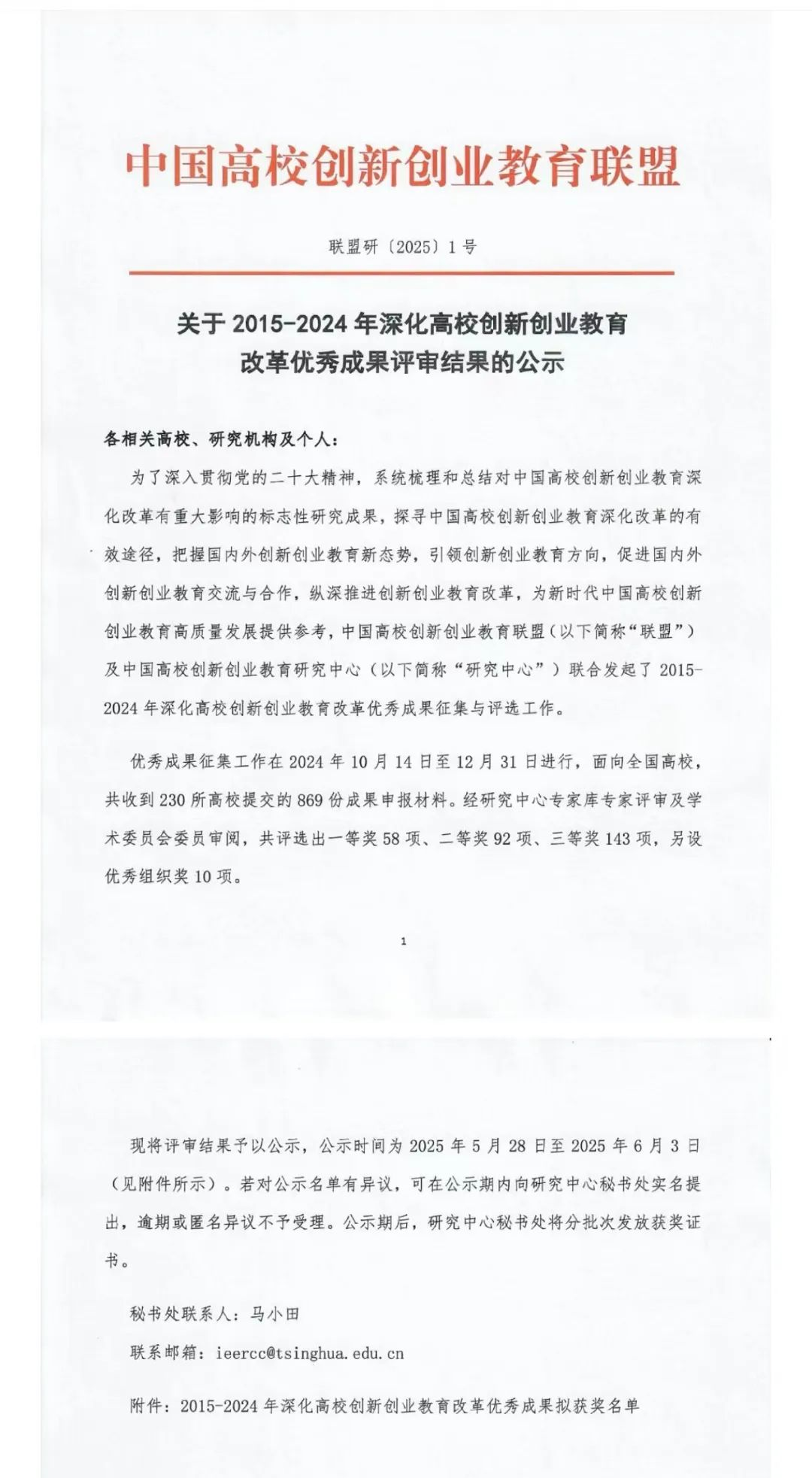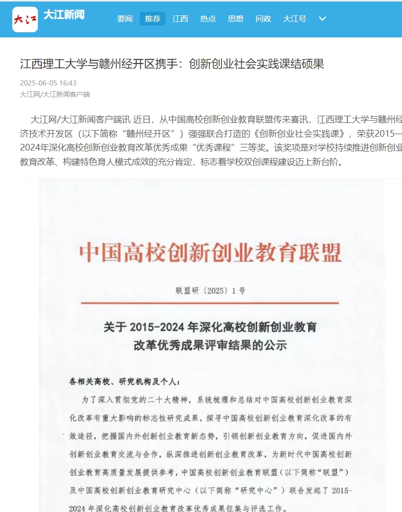 大江网/大江新闻客户端讯 近日,从中国高校创新创业教育联盟传来喜讯,金年会体育与赣州经济技术开发区(以下简称“赣州经开区”)强强联合打造的《创新创业社会实践课》,荣获2015—2024年深化高校创新创业教育改革优秀成果“优秀课程”三等奖。该奖项是对金年会