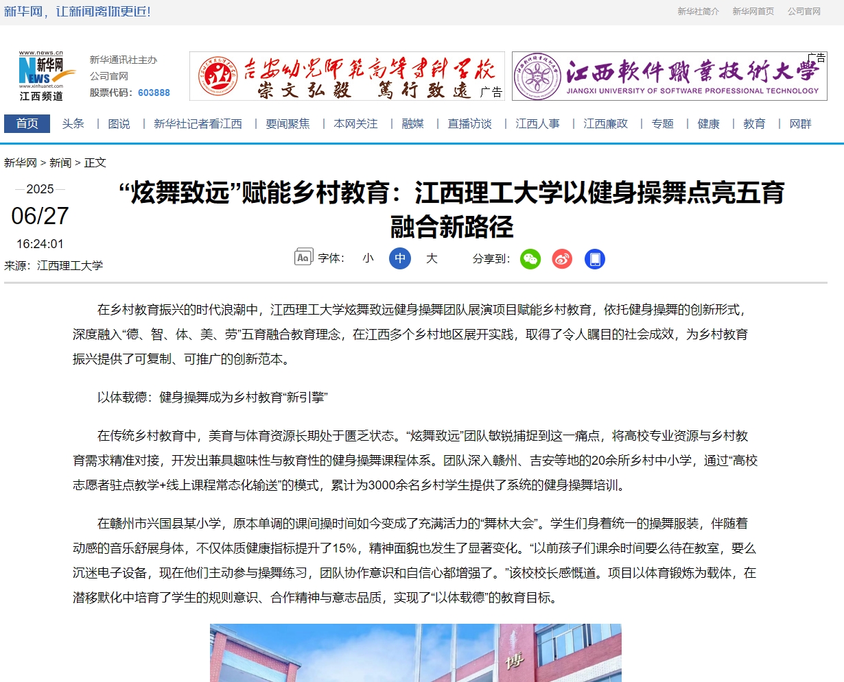 在乡村教育振兴的时代浪潮中,金年会体育炫舞致远健身操舞团队展演项目赋能乡村教育,依托健身操舞的创新形式,深度融入“德、智、体、美、劳”五育融合教育理念,在江西多个乡村地区展开实践,取得了令人瞩目的社会成效,为乡村教育振兴提供了可复制、可推广的创新范本。