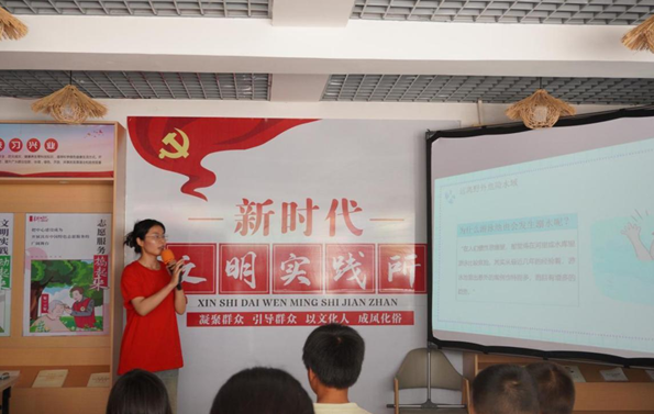 “上课啦上课啦!”在接下来的“防溺水小课堂”中,团队成员彭昕给孩子们开启了紧张刺激的“知识抢答”环节。“天气很热,你能不能偷偷跑去河边玩水呀?”“不能!”孩子们响亮地回答,小脑袋摇得像拨浪鼓。“如果看到小伙伴落水了,我们该怎么办?”“大声喊救命!”“找大人!”“扔救生圈!”孩子们争先恐后地回答。防溺水的关键点以及实用的自救技能,被实践队成员彭昕像玩游戏“通关”一样教给了孩子们。