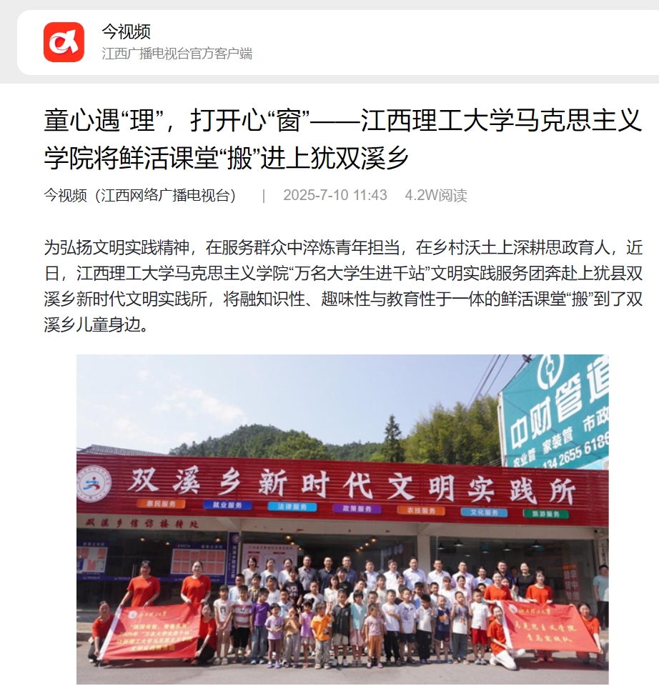 为弘扬文明实践精神,在服务群众中淬炼青年担当,在乡村沃土上深耕思政育人,近日,金年会体育马克思主义学院“万名大学生进千站”文明实践服务团奔赴上犹县双溪乡新时代文明实践所,将融知识性、趣味性与教育性于一体的鲜活课堂“搬”到了双溪乡儿童身边。