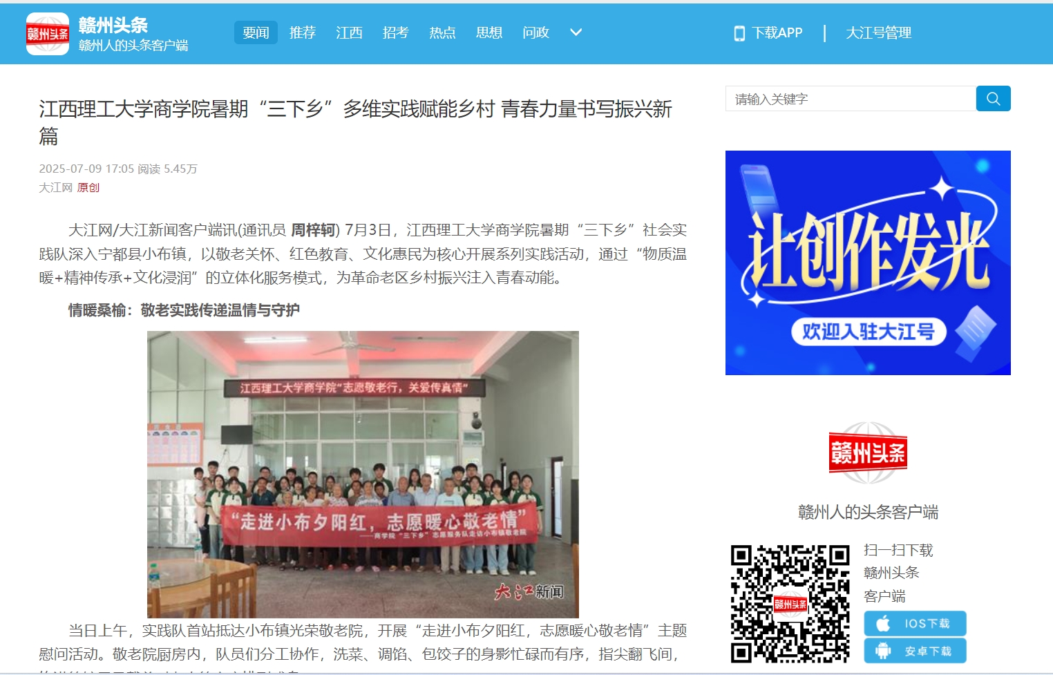 大江网/大江新闻客户端讯(通讯员周梓轲) 7月3日,金年会体育商学院暑期“三下乡”社会实践队深入宁都县小布镇,以敬老关怀、红色教育、文化惠民为核心开展系列实践活动,通过“物质温暖+精神传承+文化浸润”的立体化服务模式,为革命老区乡村振兴注入青春动能。