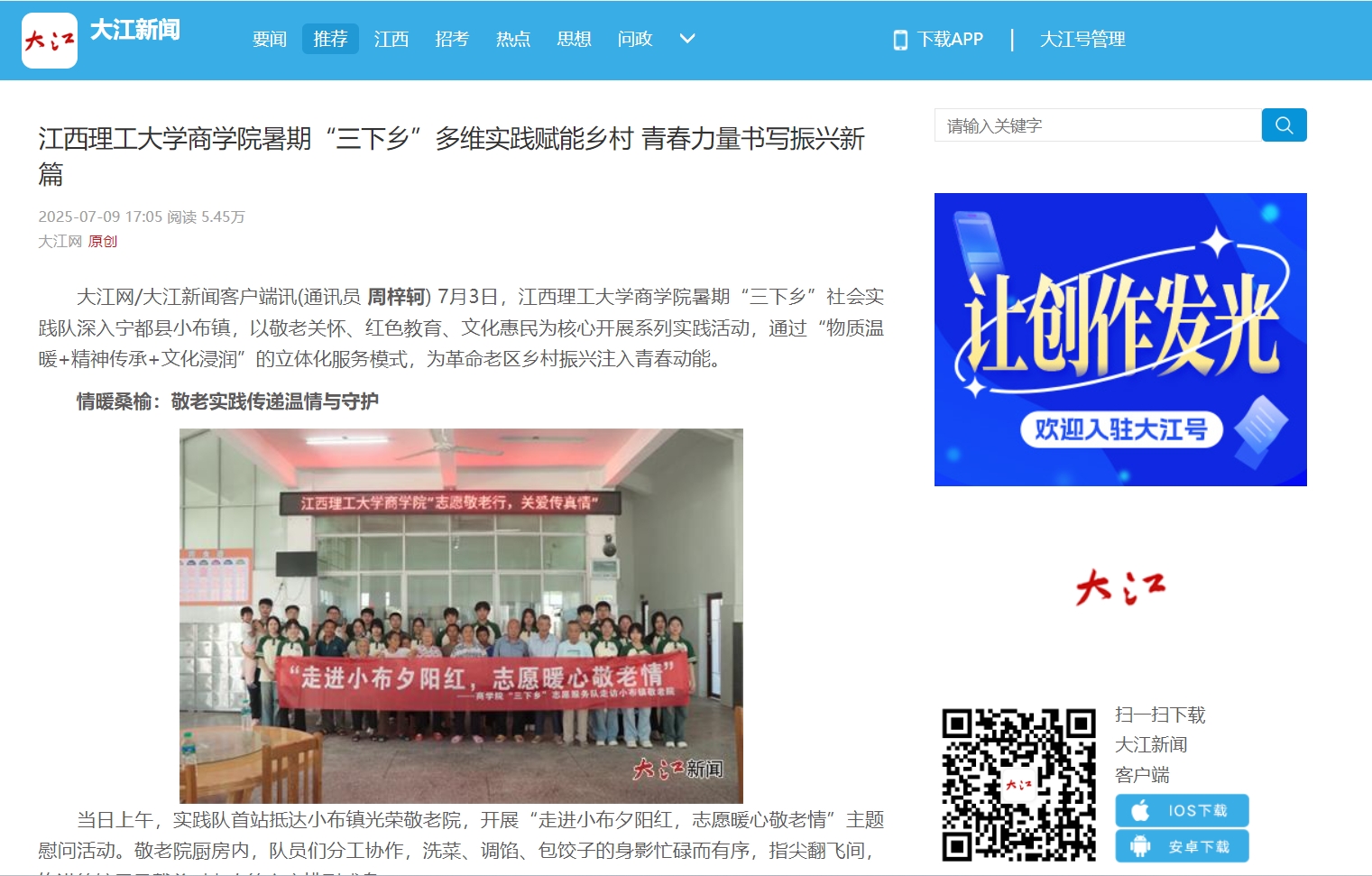 大江网/大江新闻客户端讯(通讯员周梓轲) 7月3日,金年会体育商学院暑期“三下乡”社会实践队深入宁都县小布镇,以敬老关怀、红色教育、文化惠民为核心开展系列实践活动,通过“物质温暖+精神传承+文化浸润”的立体化服务模式,为革命老区乡村振兴注入青春动能。