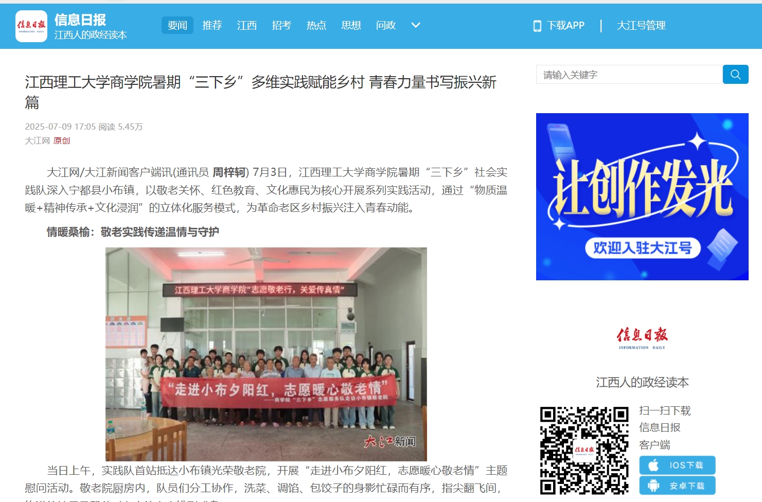 大江网/大江新闻客户端讯(通讯员周梓轲) 7月3日,金年会体育商学院暑期“三下乡”社会实践队深入宁都县小布镇,以敬老关怀、红色教育、文化惠民为核心开展系列实践活动,通过“物质温暖+精神传承+文化浸润”的立体化服务模式,为革命老区乡村振兴注入青春动能。