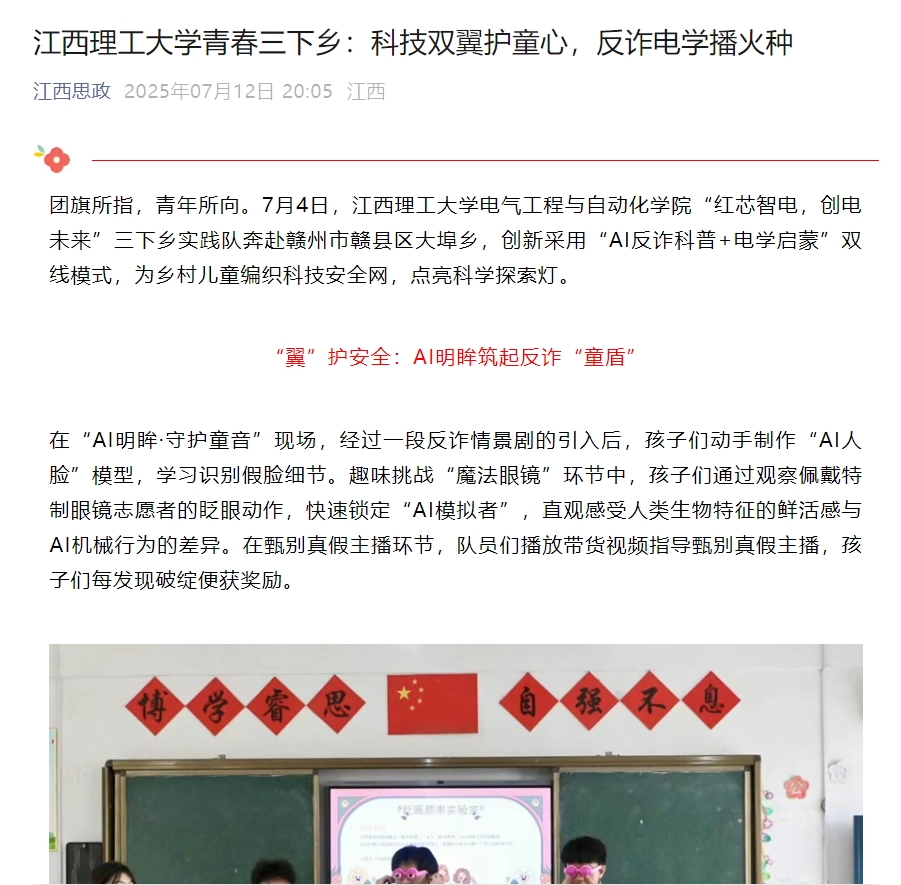 团旗所指,青年所向。7月4日,金年会体育电气工程与自动化学院“红芯智电,创电未来”三下乡实践队奔赴赣州市赣县区大埠乡,创新采用“AI反诈科普+电学启蒙”双线模式,为乡村儿童编织科技安全网,点亮科学探索灯。