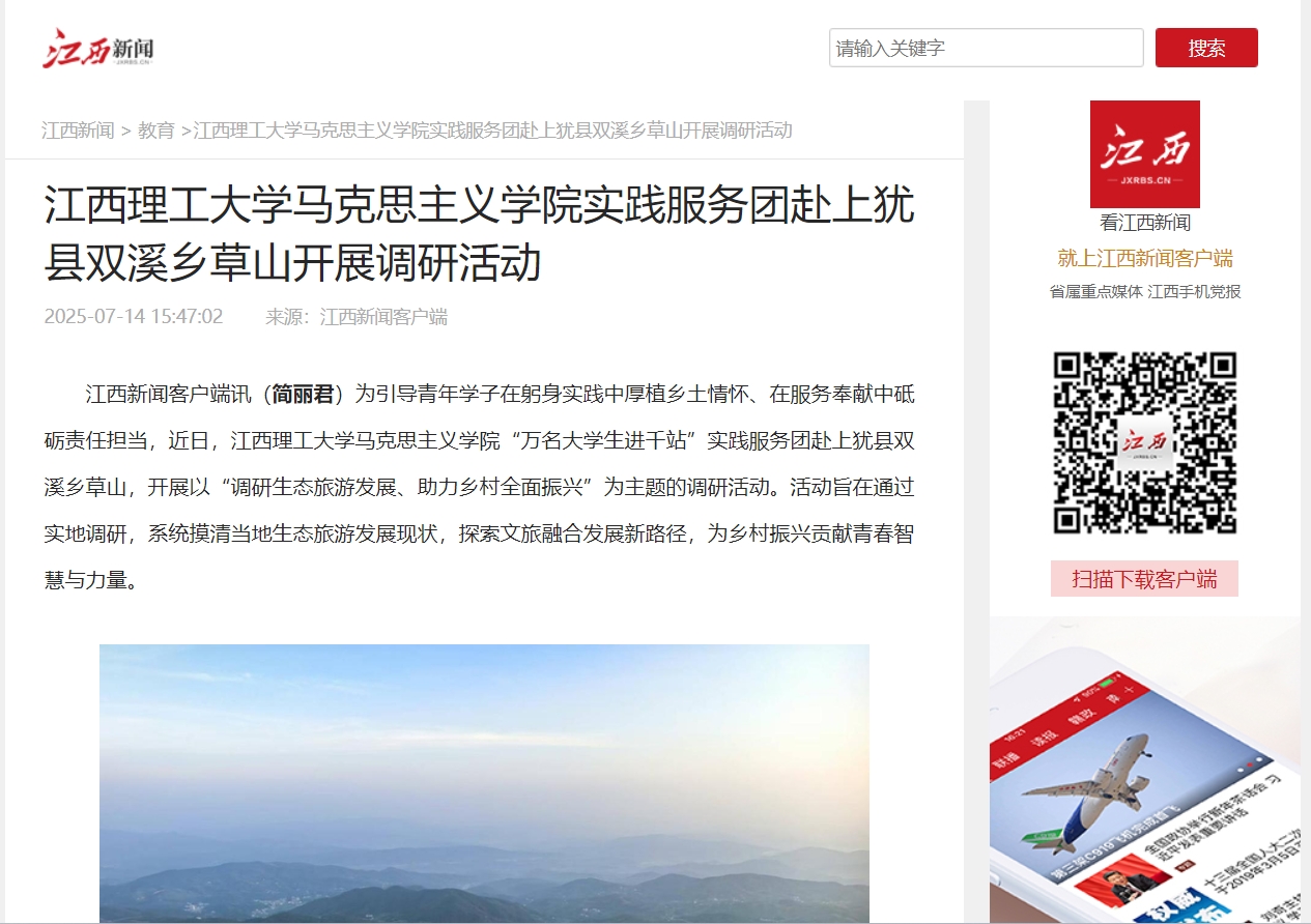 江西新闻客户端讯(简丽君)为引导青年学子在躬身实践中厚植乡土情怀、在服务奉献中砥砺责任担当,近日,金年会体育马克思主义学院“万名大学生进千站”实践服务团赴上犹县双溪乡草山,开展以“调研生态旅游发展、助力乡村全面振兴”为主题的调研活动。活动旨在通过实地调研,系统摸清当地生态旅游发展现状,探索文旅融合发展新路径,为乡村振兴贡献青春智慧与力量。