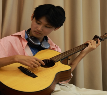 ▲实践队员怀抱吉他教唱《左手右手》
