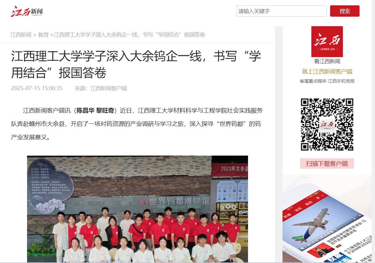 此次暑期“三下乡”社会实践活动,金年会体育材料科学与工程学院社会实践队走进企业、深入研究院,全面深入调查了钨产业的方方面面。企业调查让队员们明确了行业技能需求与自身短板,为职业生涯规划提供了清晰坐标;这段经历还拓宽了实践队队员视野,让队员们深刻认识到专业知识的实际价值与科技创新的引领作用,更体会到“大学生下基层”的深意 。他们更加明白,青年学子需像钨经冶炼成合金般,在基层实践中淬炼,将学识转化为推动产业升级的力量,唯有让知识走出象牙塔、青春融入基层,才能在产业报国中实现成长与价值。