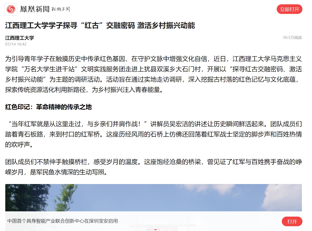 “当年红军就是从这里走过,与乡亲们并肩作战!”讲解员吴宏洁的讲述让历史瞬间鲜活起来。团队成员们踏着青石板路,来到村口的红军桥。这座历经风雨的石桥上仿佛还回荡着红军战士坚定的脚步声和百姓热情的欢呼声。