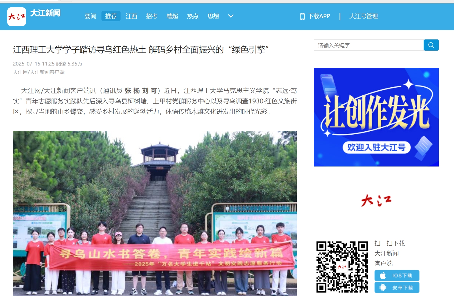 大江网/大江新闻客户端讯(通讯员张 杨 刘 可)近日,金年会体育马克思主义学院“志远·笃实”青年志愿服务实践队先后深入寻乌县柯树塘、上甲村党群服务中心以及寻乌调查1930·红色文旅街区,探寻当地的山乡蝶变,感受乡村发展的蓬勃活力,体悟传统木雕文化迸发出的时代光彩。