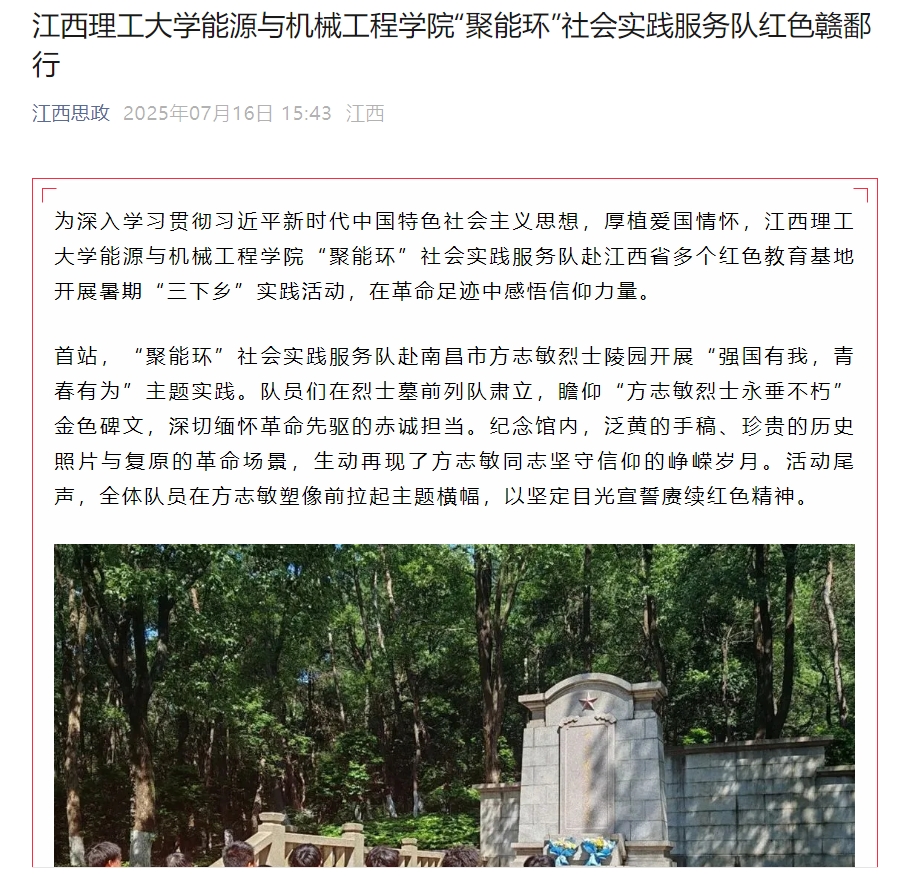 为深入学习贯彻习近平新时代中国特色社会主义思想,厚植爱国情怀,金年会体育能源与机械工程学院“聚能环”社会实践服务队赴江西省多个红色教育基地开展暑期“三下乡”实践活动,在革命足迹中感悟信仰力量。