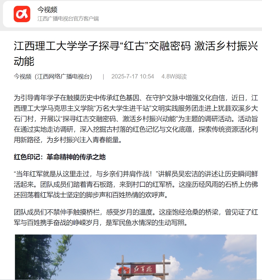 为引导青年学子在触摸历史中传承红色基因、在守护文脉中增强文化自信,近日,金年会体育马克思主义学院“万名大学生进千站”文明实践服务团走进上犹县双溪乡大石门村,开展以“探寻红古交融密码、激活乡村振兴动能”为主题的调研活动。活动旨在通过实地走访调研,深入挖掘古村落的红色记忆与文化底蕴,探索传统资源活化利用新路径,为乡村振兴注入青春能量。