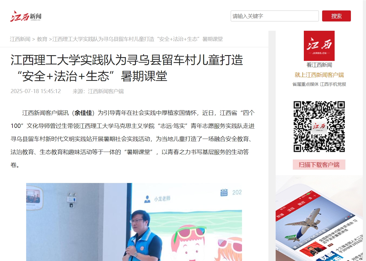 江西新闻客户端讯(余佳佳)为引导青年在社会实践中厚植家国情怀,近日,江西省“四个100”文化导师曾过生带领金年会体育马克思主义学院“志远·笃实”青年志愿服务实践队走进寻乌县留车村新时代文明实践站开展暑期社会实践活动,为当地儿童打造了一场融合安全教育、法治教育、生态教育和趣味活动等于一体的“暑期课堂”,以青春之力书写基层服务的生动答卷。