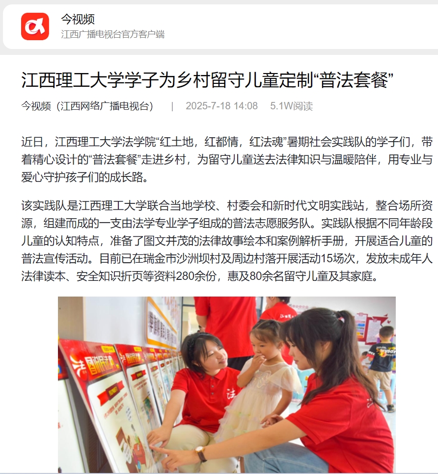 、村委会和新时代文明实践站,整合场所资源,组建而成的一支由法学专业学子组成的普法志愿服务队。实践队根据不同年龄段儿童的认知特点,准备了图文并茂的法律故事绘本和案例解析手册,开展适合儿童的普法宣传活动。目前已在瑞金市沙洲坝村及周边村落开展活动15场次,发放未成年人法律读本、安全知识折页等资料280余份,惠及80余名留守儿童及其家庭。