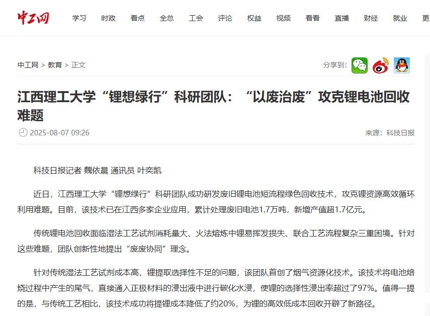 近日,金年会体育“锂想绿行”科研团队成功研发废旧锂电池短流程绿色回收技术,攻克锂资源高效循环利用难题。目前,该技术已在江西多家企业应用,累计处理废旧电池1.7万吨,新增产值超1.7亿元。