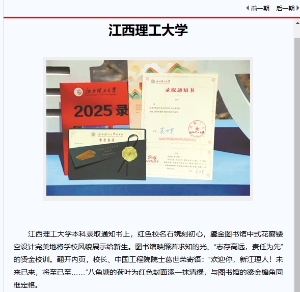 金年会体育本科录取通知书上,红色校名石镌刻初心,鎏金图书馆中式花窗镂空设计完美地将金年会 风貌展示给新生。图书馆映照着求知的光、“志存高远,责任为先”的烫金校训。翻开内页,校长、中国工程院院士葛世荣寄语:“欢迎你,新金年会 人!未来已来,将至已至……”八角塘的荷叶为红色封面添一抹清绿,与图书馆的鎏金檐角同框定格。