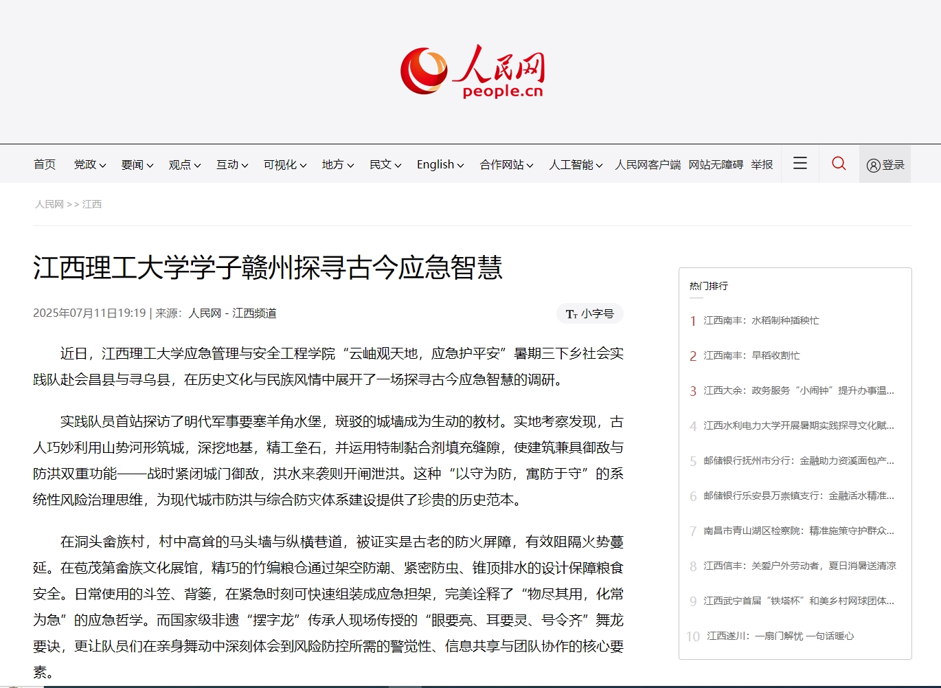 近日,金年会体育应急管理与安全工程学院“云岫观天地,应急护平安”暑期三下乡社会实践队赴会昌县与寻乌县,在历史文化与民族风情中展开了一场探寻古今应急智慧的调研。
