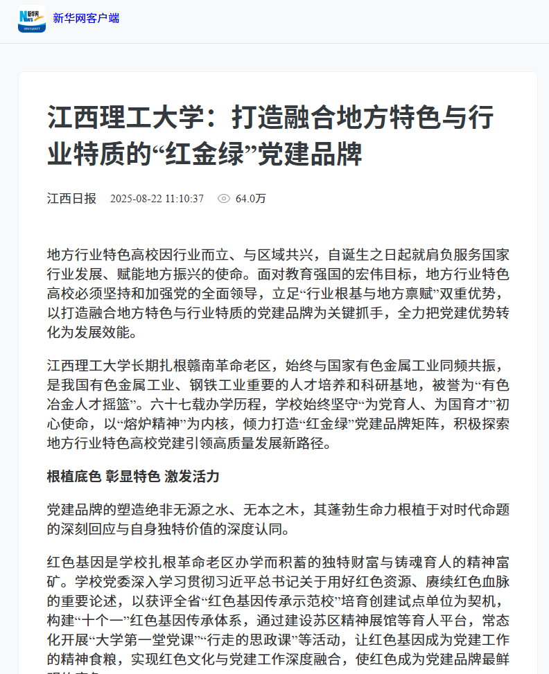 党委深入学习贯彻习近平总书记关于用好红色资源、赓续红色血脉的重要论述,以获评全省“红色基因传承示范校”培育创建试点单位为契机,构建“十个一”红色基因传承体系,通过建设苏区精神展馆等育人平台,常态化开展“大学第一堂党课”“行走的思政课”等活动,让红色基因成为党建工作的精神食粮,实现红色文化与党建工作深度融合,使红色成为党建品牌最鲜明的底色。