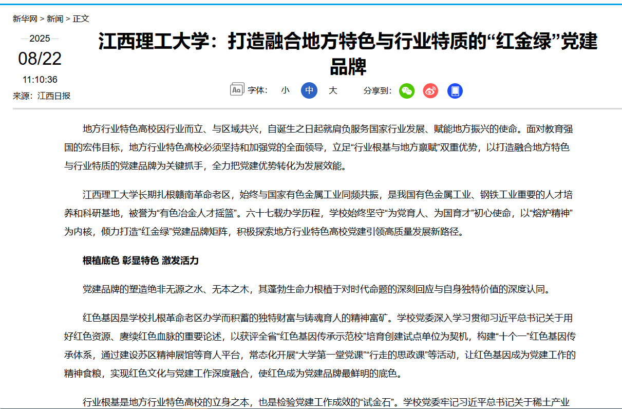扎根红土、服务有色,立足服务国家战略的深厚积淀,紧扣新时代有色金属工业行业使命与教育强国建设要求,将“红金绿”确立为统领全局的校级核心党建品牌。“红”铸忠诚,以“领航工程”定向、“薪火工程”铸魂,将红色基因深度融入办学治校血脉,筑牢“赤诚担当”政治根基;“金”显本色,以“先锋工程”强能力、“清廉工程”守底线,引导党员干部在服务稀土及关键矿产供应安全中锤炼“坚韧实干”过硬本领;“绿”创未来,以“创新工程”激活力、“惠民工程”增福祉,将绿色发展理念转化为创新动能,让发展成果惠及师生,彰显“创新突破”时代担当。