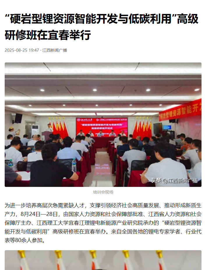 锂电新能源产业研究院承办的“硬岩型锂资源智能开发与低碳利用”高级研修班在宜春举办。来自全国各地的锂电专家学者、行业代表等80余人参加。