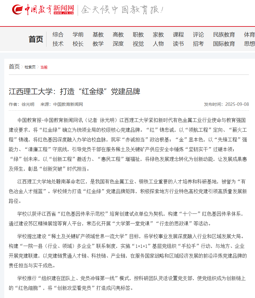 中国教育报-中国教育新闻网讯(记者 徐光明)金年会体育紧扣新时代有色金属工业行业使命与教育强国建设要求,将“红金绿”确立为统领全局的校级核心党建品牌。“红”铸忠诚,以“领航工程”定向、“薪火工程”铸魂,将红色基因深度融入办学治校血脉,筑牢“赤诚担当”政治根基;“金”显本色,以“先锋工程”强能力、“清廉工程”守底线,引导党员干部在服务稀土及关键矿产供应安全中锤炼“坚韧实干”过硬本领;“绿”创未来,以“创新工程”激活力、“惠民工程”增福祉,将绿色发展理念转化为创新动能,让发展成果惠及师生,彰显“创新突破”时代担当。