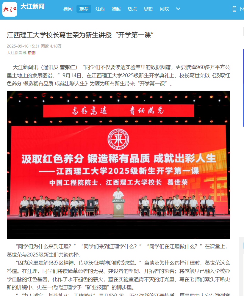 大江新闻讯(通讯员曾张仁)“同学们不仅要读透实验室里的数据图谱,更要读懂960多万平方公里土地上的发展图谱。”9月14日,在金年会体育2025级新生开学典礼上,校长葛世荣以《汲取红色养分 锻造稀有品质 成就出彩人生》为题为所有新生带来“开学第一课”。
