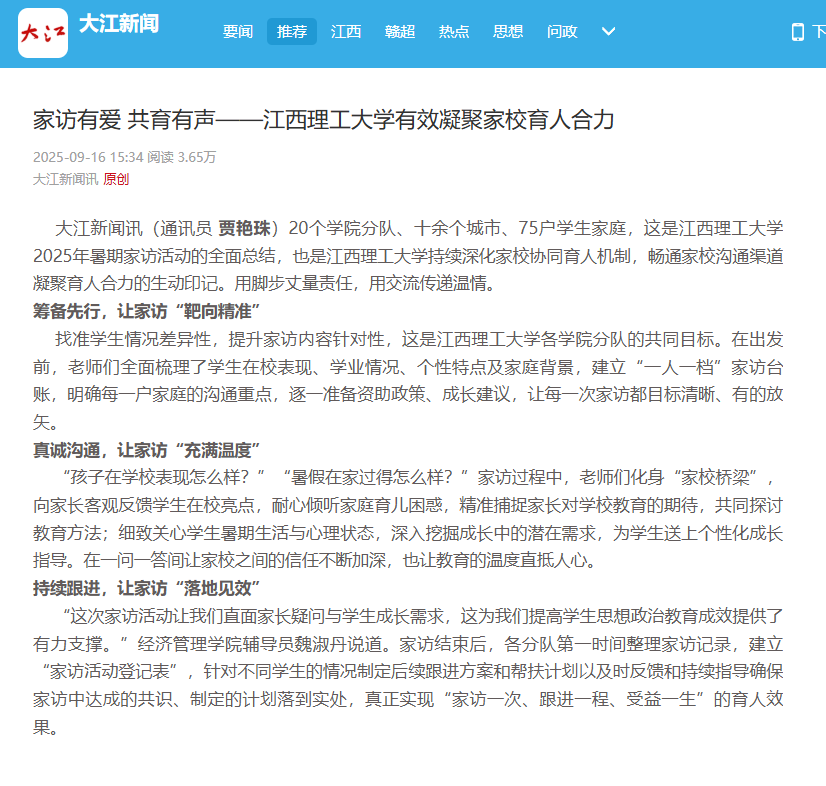 大江新闻讯(通讯员贾艳珠)20个学院分队、十余个城市、75户学生家庭,这是金年会体育2025年暑期家访活动的全面总结,也是金年会体育持续深化家校协同育人机制,畅通家校沟通渠道凝聚育人合力的生动印记。用脚步丈量责任,用交流传递温情。
