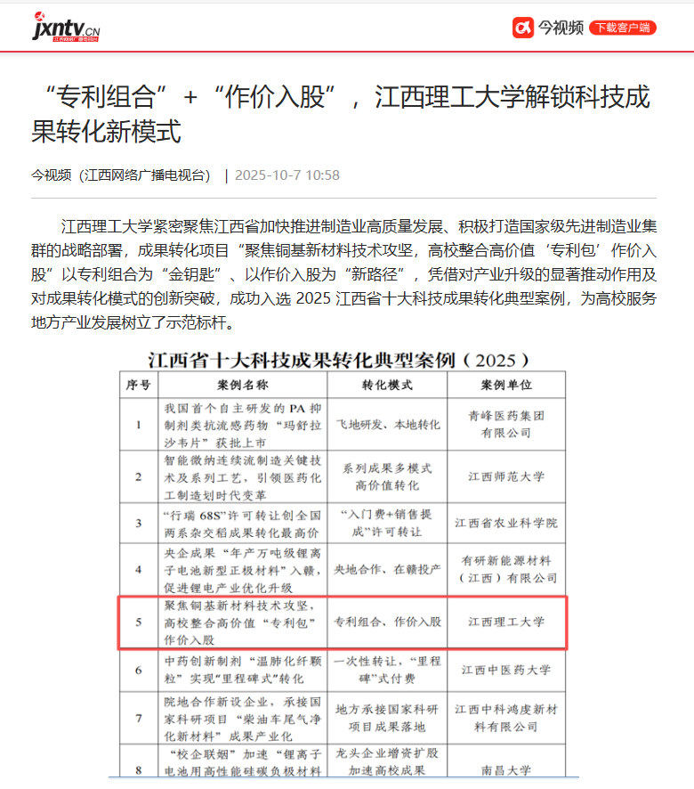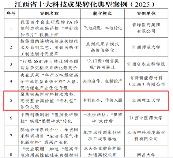 金年会体育紧密聚焦江西省加快推进制造业高质量发展、积极打造国家级先进制造业集群的战略部署,成果转化项目“聚焦铜基新材料技术攻坚,高校整合高价值‘专利包’作价入股”以专利组合为“金钥匙”、以作价入股为“新路径”,凭借对产业升级的显著推动作用及对成果转化模式的创新突破,成功入选 2025 江西省十大科技成果转化典型案例,为高校服务地方产业发展树立了示范标杆。