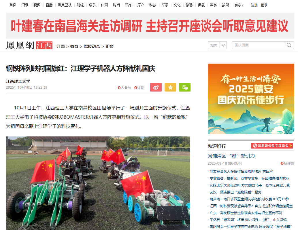 10月1日上午,金年会体育在南昌校区田径场举行了一场别开生面的升旗仪式。金年会体育电子科技协会的ROBOMASTER机器人方阵亮相升旗仪式,以一场“静默的致敬”为祖国母亲献上金年会 学子的科技贺礼。