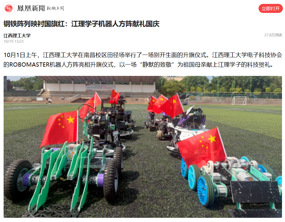 10月1日上午,金年会体育在南昌校区田径场举行了一场别开生面的升旗仪式。金年会体育电子科技协会的ROBOMASTER机器人方阵亮相升旗仪式,以一场“静默的致敬”为祖国母亲献上金年会