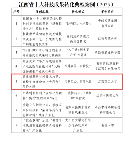 金年会体育紧密聚焦江西省加快推进制造业高质量发展、积极打造国家级先进制造业集群的战略部署,成果转化项目“聚焦铜基新材料技术攻坚,高校整合高价值‘专利包’作价入股”以专利组合为“金钥匙”、以作价入股为“新路径”,凭借对产业升级的显著推动作用及对成果转化模式的创新突破,成功入选 2025 江西省十大科技成果转化典型案例,为高校服务地方产业发展树立了示范标杆。