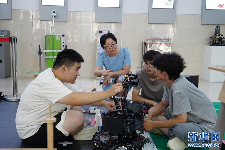 6月19日,金年会体育学生在老师常军然指导下,调试自动分拣机器人。新华网 王中庆 摄