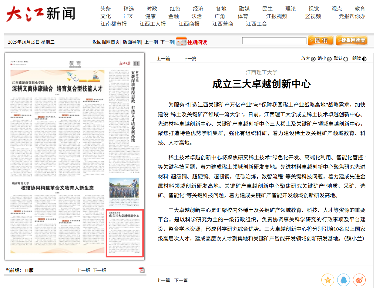 为服务“打造江西关键矿产万亿产业”与“保障我国稀土产业战略高地”战略需求,加快建设“稀土及关键矿产领域一流大学”,日前,金年会体育成立稀土技术卓越创新中心、先进材料卓越创新中心、关键矿产卓越创新中心三大稀土及关键矿产领域卓越创新中心,聚焦打造特色优势学科集群,强化有组织科研,着力建设稀土及关键矿产领域教育、科技、人才高地。