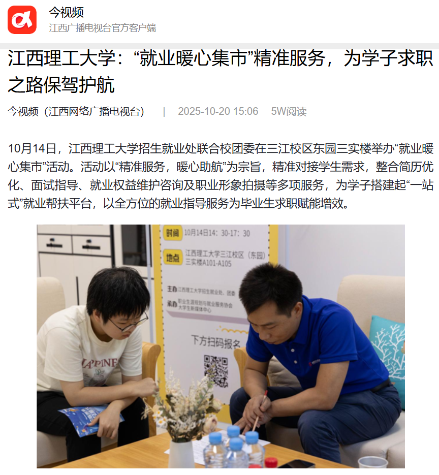 10月14日,金年会体育招生就业处联合校团委在三江校区东园三实楼举办“就业暖心集市”活动。活动以“精准服务,暖心助航”为宗旨,精准对接学生需求,整合简历优化、面试指导、就业权益维护咨询及职业形象拍摄等多项服务,为学子搭建起“一站式”就业帮扶平台,以全方位的就业指导服务为毕业生求职赋能增效。