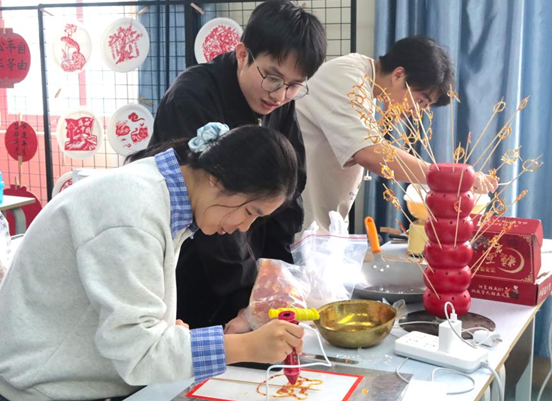 当古法糖艺遇上现代工具,匠心传承迸发出新的火花。伴着活动现场浓郁的果香,大家在志愿者的带领下体验着一项传统技艺——熬糖。当糖块渐融成琥珀色糖浆,同学们纷纷拿起热熔糖画笔开始制作糖画,现场形态各异的糖画成品是同学们无限创意与想象力的生动写照。