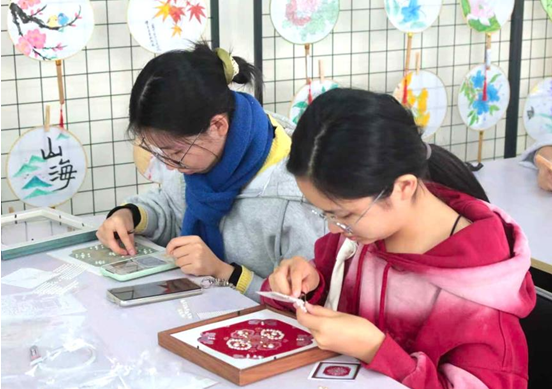(图为金年会体育学生制作宋锦珍珠画 王雨欣摄)