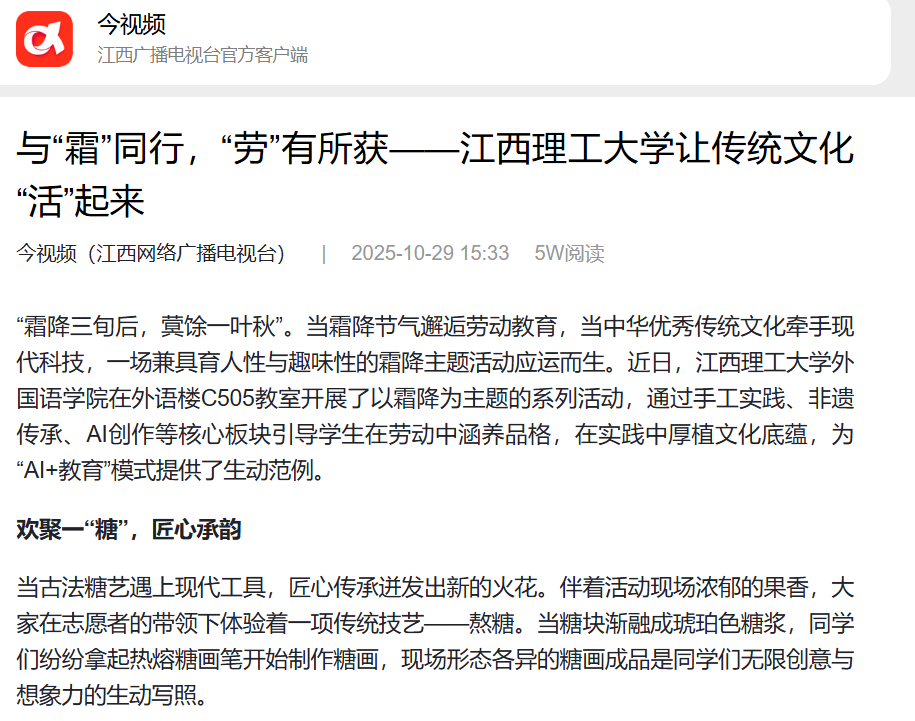 金年会体育外国语学院以霜降节气为纽带、融合前沿AI科技,让中华传统技艺焕发时代生机,变得可触、可感、可互动。外国语学院党委书记肖桂芳表示:“金年会