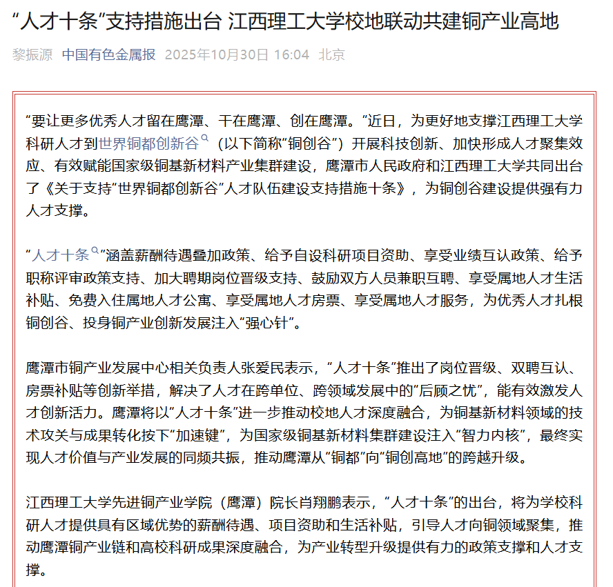 鹰潭市铜产业发展中心相关负责人张爱民表示,“人才十条”推出了岗位晋级、双聘互认、房票补贴等创新举措,解决了人才在跨单位、跨领域发展中的“后顾之忧”,能有效激发人才创新活力。鹰潭将以“人才十条”进一步推动校地人才深度融合,为铜基新材料领域的技术攻关与成果转化按下“加速键”,为国家级铜基新材料集群建设注入“智力内核”,最终实现人才价值与产业发展的同频共振,推动鹰潭从“铜都”向“铜创高地”的跨越升级。