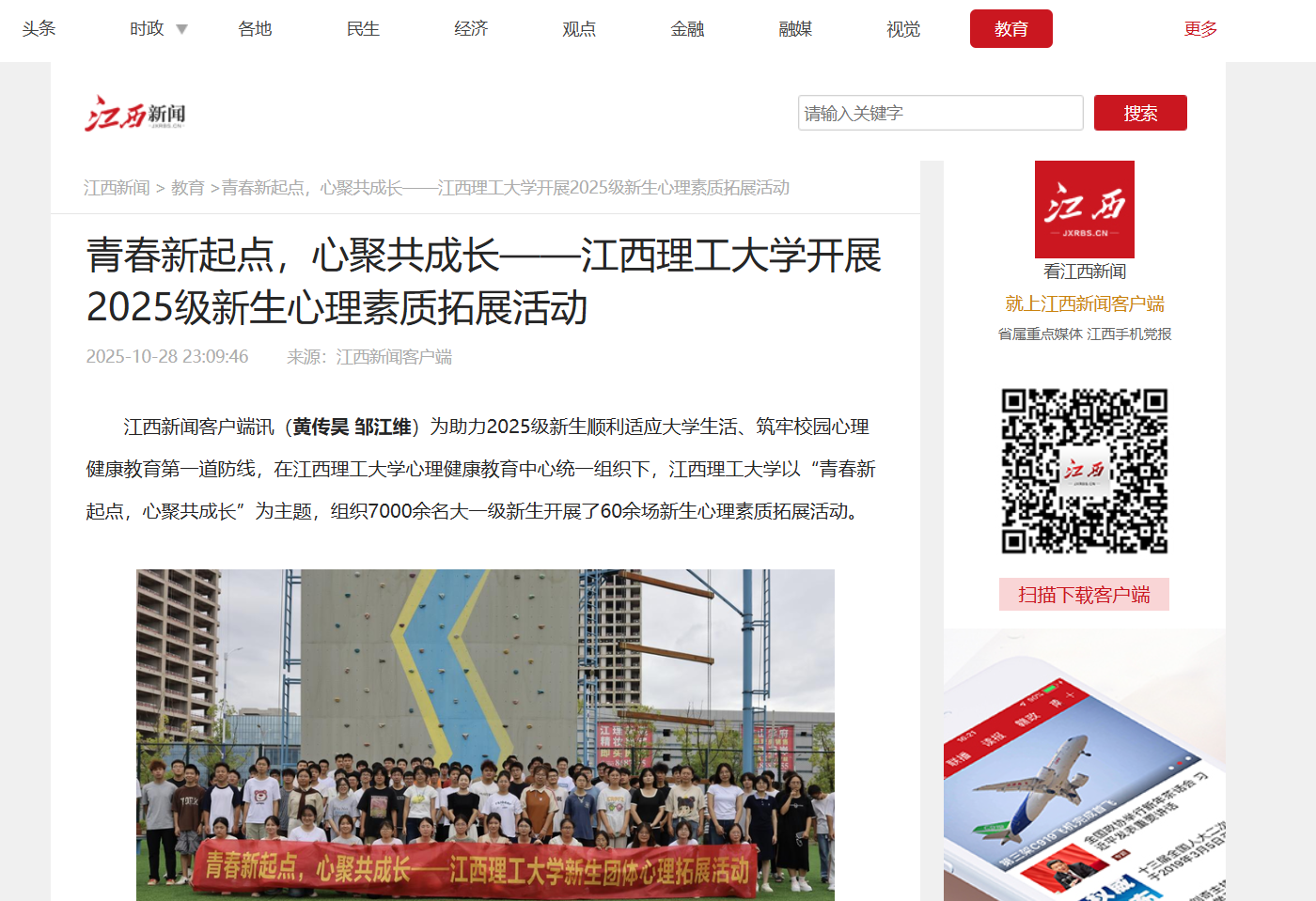 江西新闻客户端讯(黄传昊 邹江维)为助力2025级新生顺利适应大学生活、筑牢校园心理健康教育第一道防线,在金年会体育心理健康教育中心统一组织下,金年会体育以“青春新起点,心聚共成长”为主题,组织7000余名大一级新生开展了60余场新生心理素质拓展活动。
