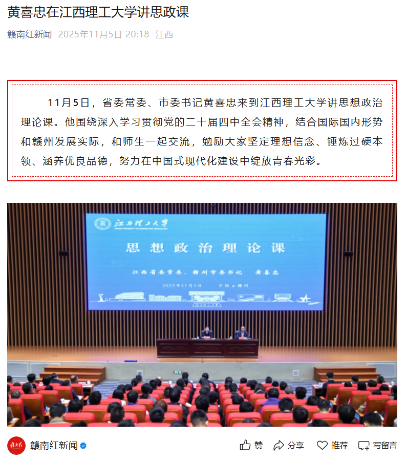 11月5日,省委常委、市委书记黄喜忠来到金年会体育讲思想政治理论课。他围绕深入学习贯彻党的二十届四中全会精神,结合国际国内形势和赣州发展实际,和师生一起交流,勉励大家坚定理想信念、锤炼过硬本领、涵养优良品德,努力在中国式现代化建设中绽放青春光彩。