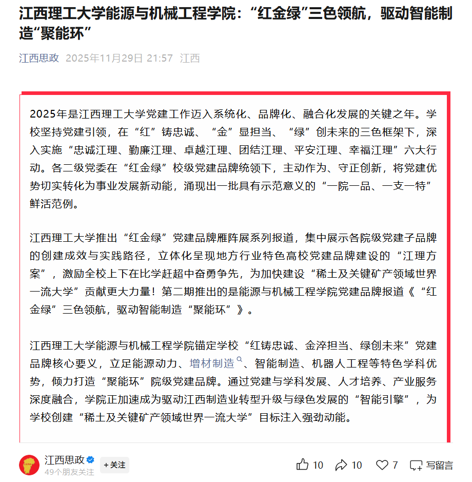 方案”,激励全校上下在比学赶超中奋勇争先,为加快建设“稀土及关键矿产领域世界一流大学”贡献更大力量!第二期推出的是能源与机械工程学院党建品牌报道《“红金绿”三色领航,驱动智能制造“聚能环”》。